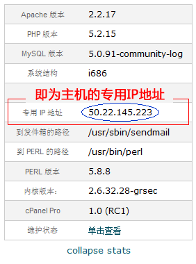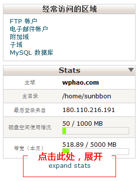 2,根据邮件中提供的控制面板信息,登录您的cPanel主机控制面板,找到左侧的 Stats 主机状态栏;点击下方的“expand stats” 展开显示全部的主机状态栏,如下图: