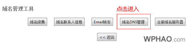 2,点击对应域名最右侧的绿色图标进入查看域名详细资料页面,该页面显示您域名的具体信息(包括注册信息、域名DNS等),在该页面最底部找到“域名管理工具”项,点击其中的“域名DNS管理”进入域名DNS管理页面。具体如下图所示: