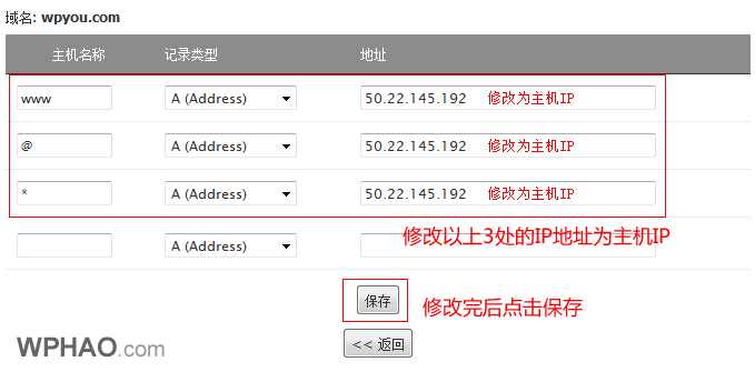 3,在域名DNS管理页面,显示的域名的DNS信息,修改其中主机名称为(www、@、*)的三项对应的A记录类型的地址为您的主机IP地址。具体如下图所示: